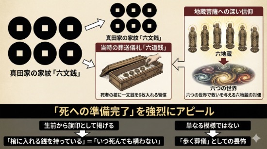 真田家の家紋は、当時の葬送儀礼である「六道銭」を模すことで、地蔵菩薩への深い信仰と「死への準備」が完了していることを強烈にアピールするものでした。