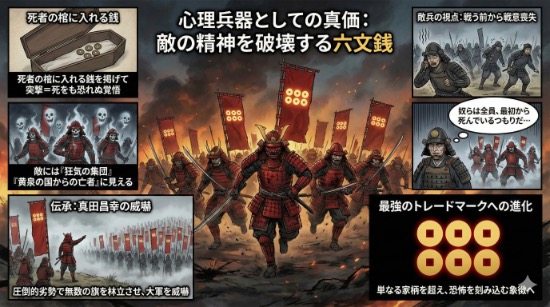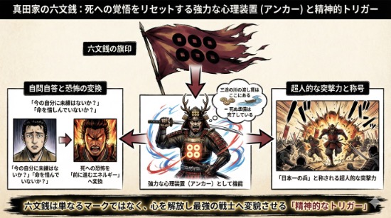 六文銭の旗印は、戦場において兵士の士気を高めるだけでなく、見るたびに「死への覚悟」をリセットさせる**強力な心理装置(アンカー)**として機能していました。