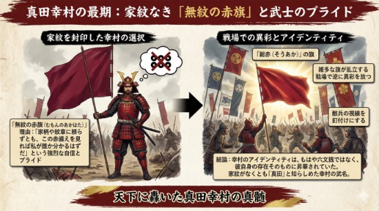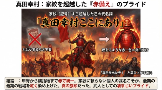 結論から言えば、大坂の陣における真田幸村は、家紋という記号すら超越し、「赤備え」そのものを己の代名詞として敵に見せつけました。
