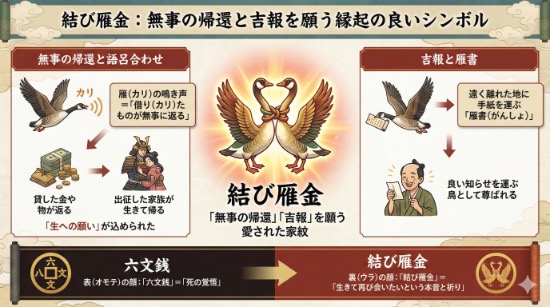 結び雁金は、戦いからの**「無事の帰還」や「吉報」**を願う、非常に縁起の良いシンボルとして愛されました。