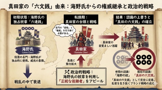 具体的には、当時すでに地域で強大な影響力を持っていた海野氏と同じ紋を掲げることは、新興勢力であった真田家にとって、自らのステータスを保証する強力な「ブランド」として機能しました。