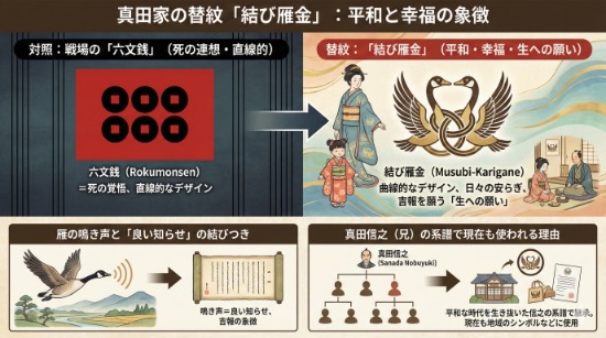 真田家の替紋として有名な**「結び雁金(むすびかりがね)」**は、渡り鳥の雁(がん)を図案化したもので、殺伐とした六文銭とは対照的に「平和」や「幸福」を象徴するデザインです。