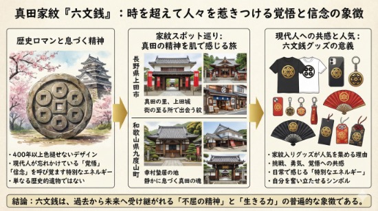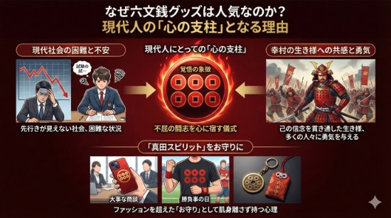六文銭をあしらったTシャツやキーホルダーが、数ある戦国グッズの中でもトップクラスの人気を誇る理由。それは、この家紋が現代人にとっての**「心の支柱」**となっているからです。
