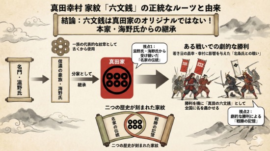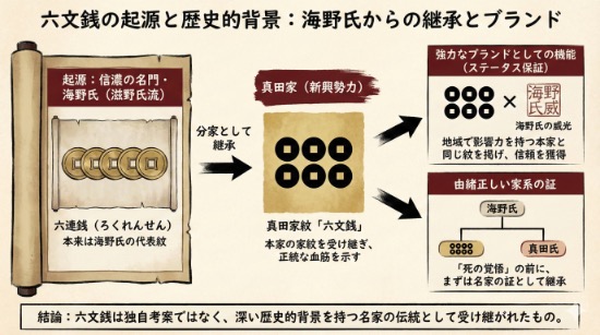 六文銭の起源は、真田家が独自に考案したものではなく、祖先である滋野氏や海野氏が使用していた**「六連銭(ろくれんせん)」**にあります。