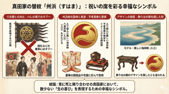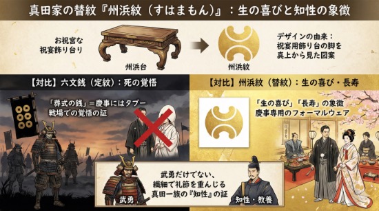 具体的には、六文銭は葬式の銭であるため、結婚式のようなハレの舞台には絶対に持ち込めないタブーな存在でした。そのため、真田家ではこの州浜紋を「慶事専用のフォーマルウェア」として使い分け、武力だけでなく高い文化的教養も兼ね備えていることを周囲に示しました。