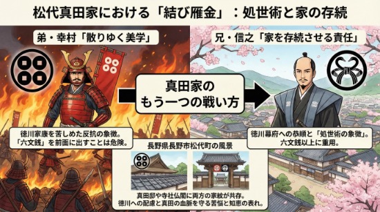なぜなら、関ヶ原の戦いや大坂の陣で徳川家康を苦しめた弟・幸村のイメージがあまりに強い「六文銭」を前面に出すことは、徳川幕府に対して無用な刺激を与えかねなかったからです。