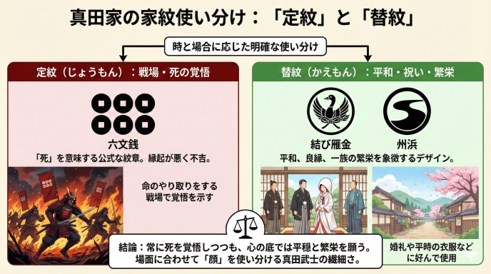 真田家は、時と場合に応じて**「定紋(じょうもん)」と「替紋(かえもん)」**という2種類の家紋を明確に使い分けていました。